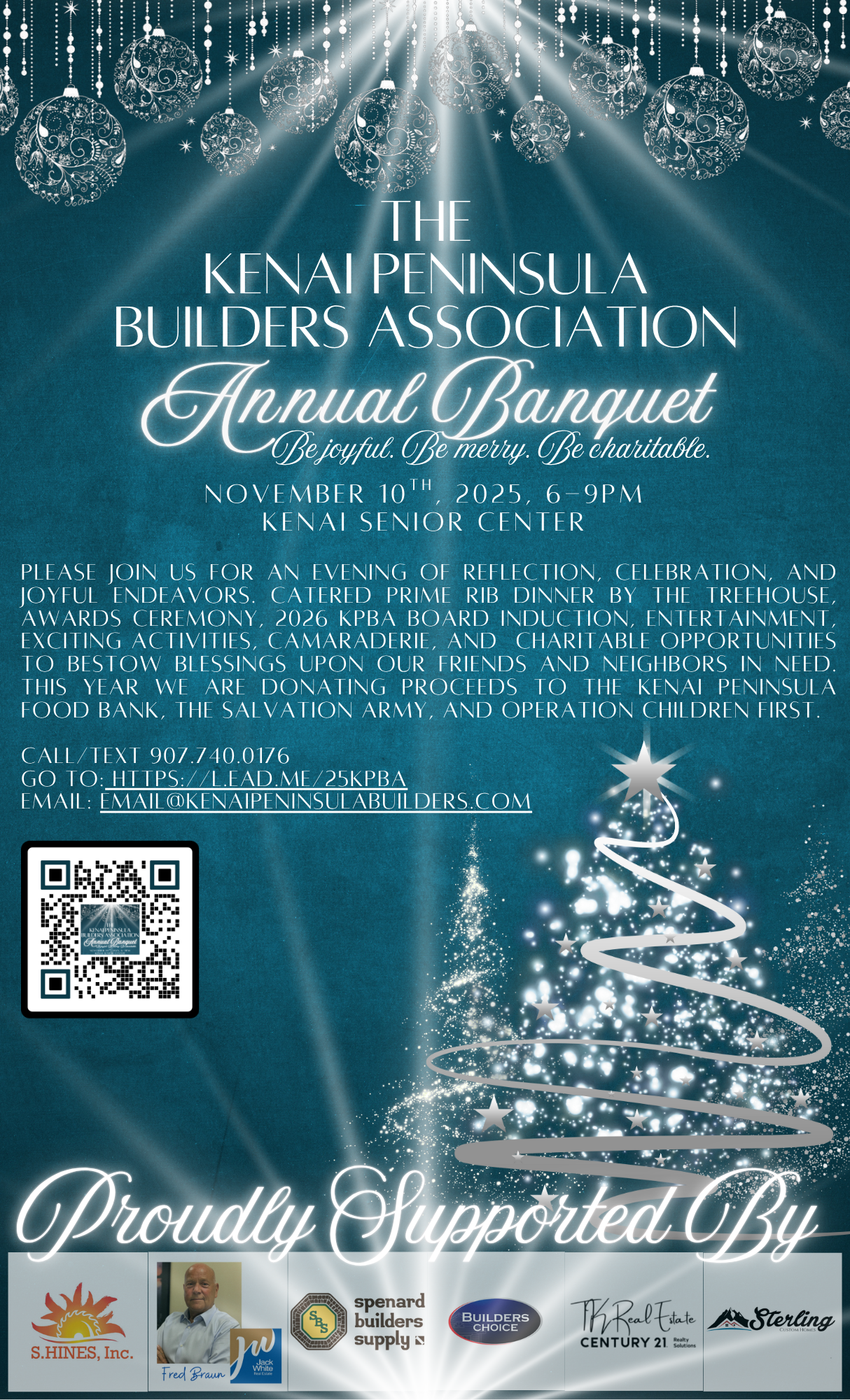 KPBA’s 2025 Annual Awards Banquet & Christmas Fundraiser – Monday, November 10th at 6PM. Join us at the Kenai Senior Center, 361 Senior Ct, Kenai, for an incredible night of celebration, unity, and generosity. Ready to sponsor, donate, or reserve your seat? CLICK HERE to open a form you can download and submit OR click the image below to buy online.***Please note, online purchase options do not allow stacking purchases and requires checking out after each item.***